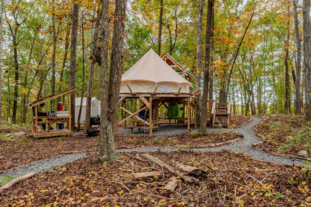 Come stay in our handcrafted glamping tent, built with traditional timber-frame joinery and wrapped in the beauty and whimsy of breathable cotton canvas. Breathe in. Draw near. Be still. Watch morning mist drift through the valley from your front porch. Take a nap as sunlight dances across the canvas. Soak in the sounds of birdsong and breeze while reading a good book. Nearby adventures: 15 min – Indian Mtn. Park 40 min – Norris Lake 45 min – Cumberland Falls 2 hr – Great Smoky Mtn. Ntl. Park