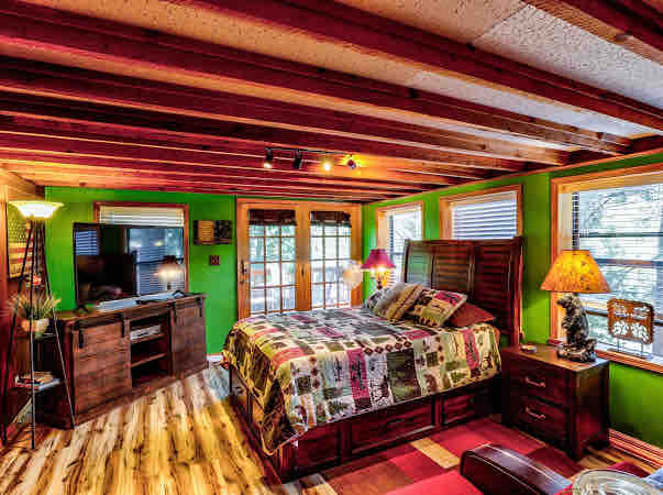 Redwood was designed for romantic weekend getaways or extended stays. It offers two covered decks; one over looks the tall ponderosa pines off of the main living area with seating and gas fire table, The second Covered deck offers a private Hot Tub, seating around the gas fire table and a Gas BBQ Grill – two level - 3 steps up to cabin entrance and main level, several steps to upper bedroom level - Wi-Fi in cabin - Roku - DVD/CD player-cabin side parking.