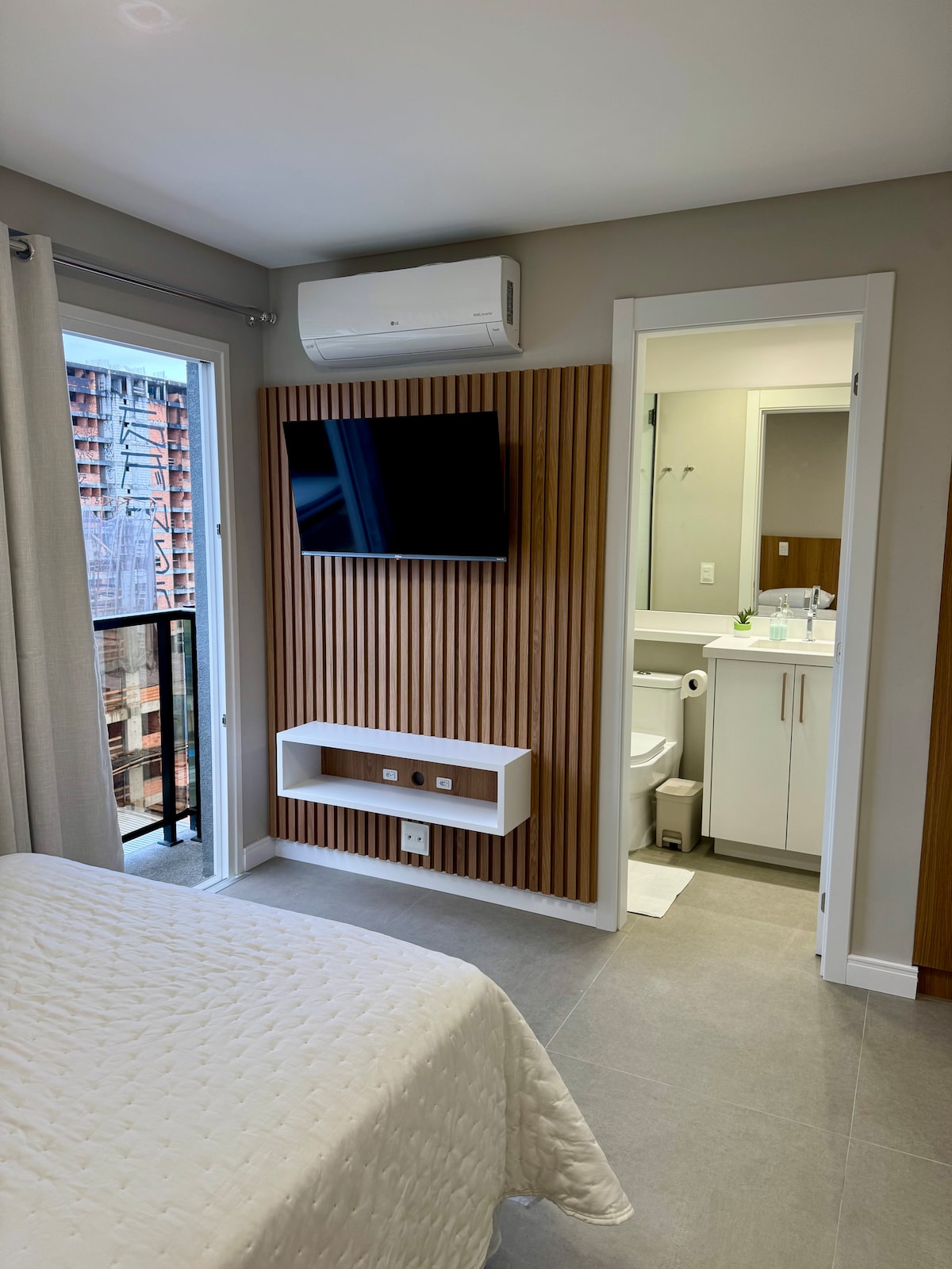 Beautiful studio apartment with garage, in the center of Blumenau, near everything! Building has a gym and an incredible rooftop pool. The apartment is complete and very stylish. Double bed, sheets, covers, pillows, bath towels, AC. Full kitchen with refrigerator, microwave and tableware for 2. Laundry with washer+dryer machine, iron table and iron.