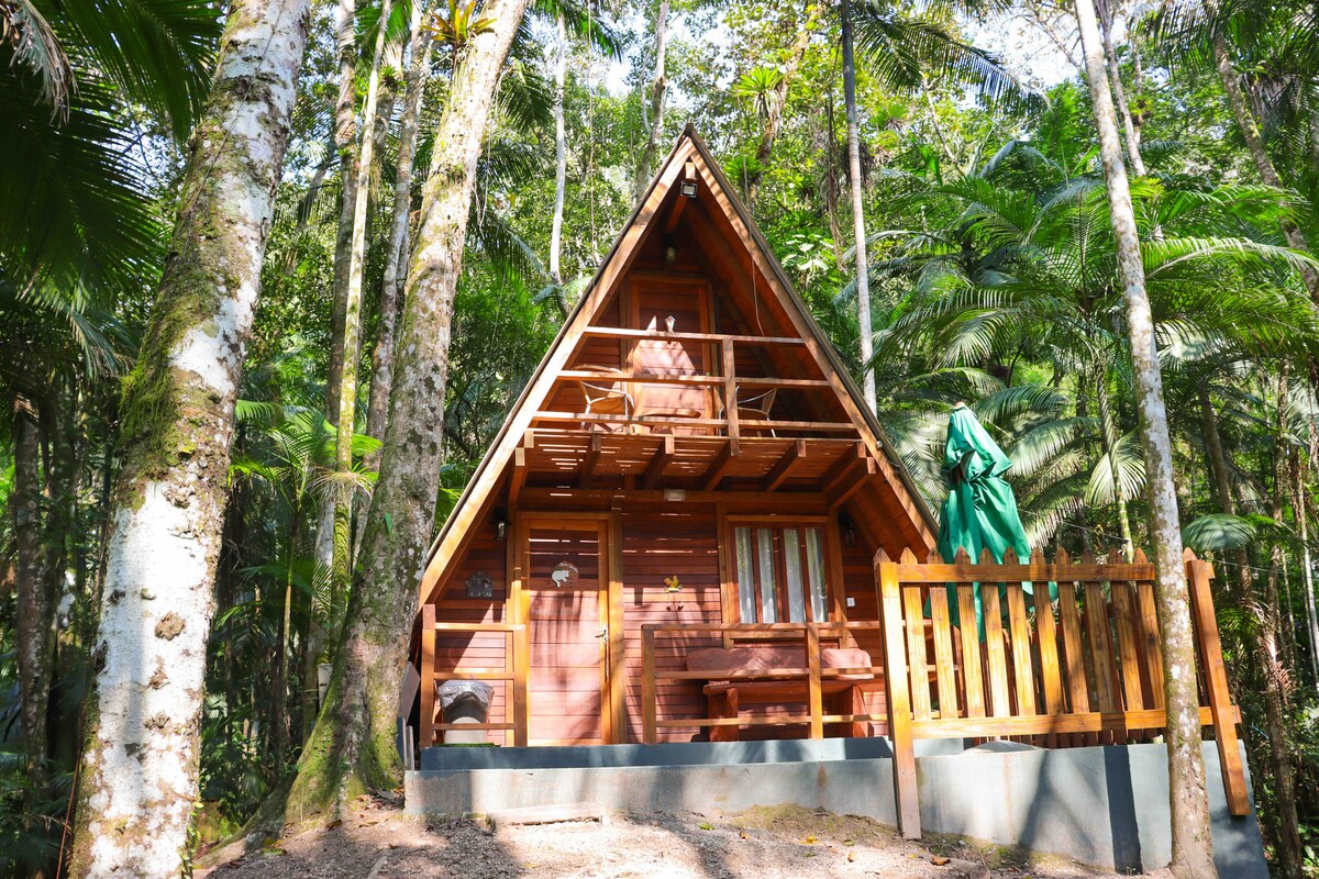 A rustic chalet integrated with nature. Imagine sleeping under the trees, listening to the sounds of the forest and the waters. An indescribable experience of connection with the fauna and flora. A place to rest, recharge and enjoy the fresh air with the abundant green of the forest Birds and wild animals sometimes pay a visit. Attention to accessibility: the chalet is in an elevated location, surrounded by nature. A brief, steep climb of approximately 50 meters is required.