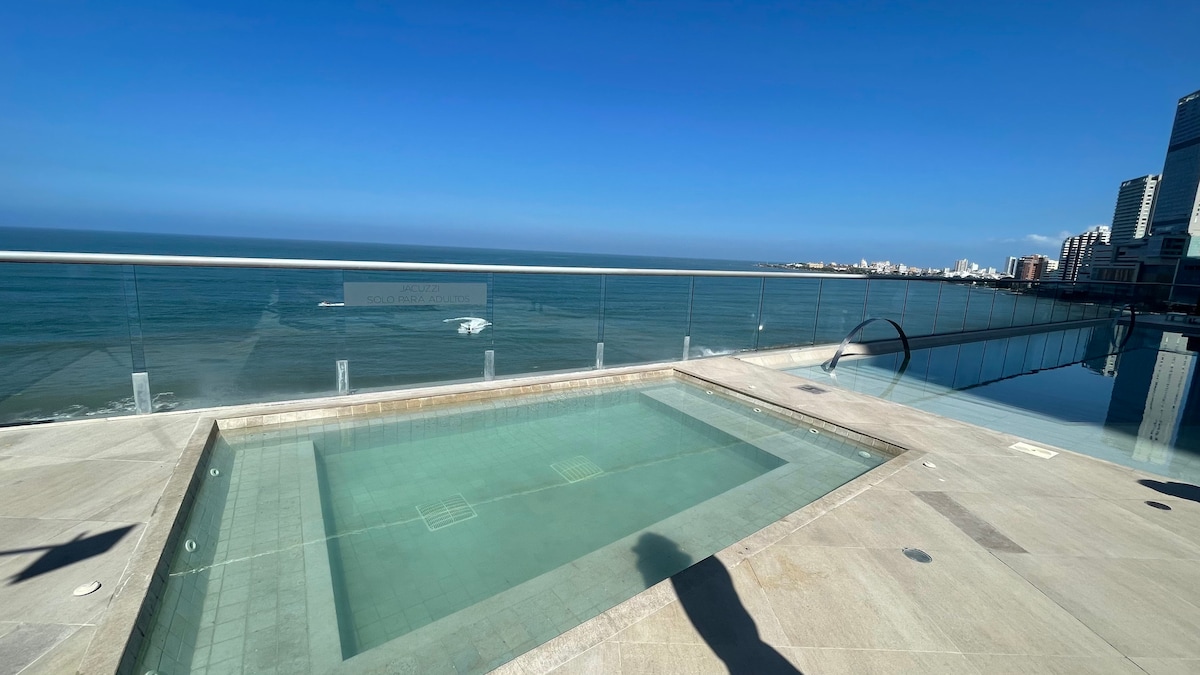 ✨ Welcome to your retreat in Cartagena: a luxury high-floor apartment facing the sea, with two private balconies and a 180° panoramic view of the Caribbean and the bay. Designed for your comfort, it features a modern living room with floor-to-ceiling windows, a fully equipped kitchen, fast WiFi, and digital check-in. Enjoy the infinity pool, poolside bar, and ocean-view gym. Located in Bocagrande, steps from the beach and minutes from the Walled City. 🌊🌴