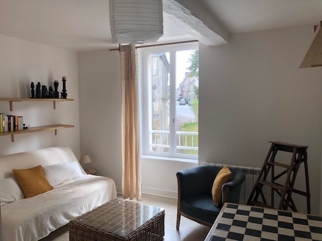 Village house in the historic center of Bellême. Very well equipped, the house has 2 bedrooms on 2nd floor. Absolute calm. We took special care to the decoration. Between antiques and more recent pieces, we hope a successful mix&match;) Free parking. Installed, you can do everything without car. Departure of hikes, shops on site. Rate per night: 2 persons/ room. If occupancy 1 person/ room, 40€ extra. Discounts applicable starting over 3 nights