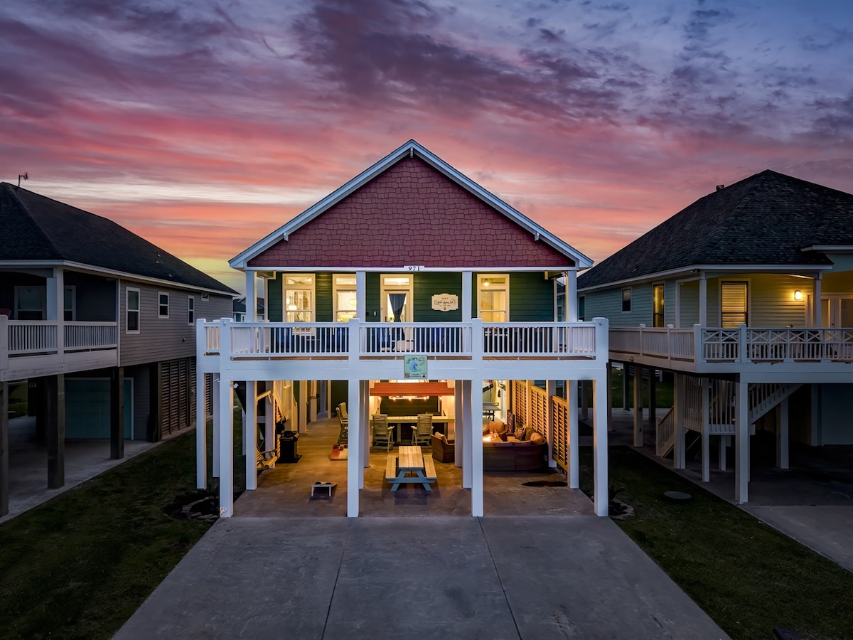Welcome to Somewhere Over The Rainbow Beach House in Crystal Beach. This is a renovated property that sleeps 16. We are one of the only homes on Port Bolivar with a private inground heated pool! From the house to the backyard it’s all for you and your crew to enjoy. 500 feet from the beach it’s an easy walking distance. which you can enjoy. A private fenced backyard, fire pit, gazebo, pergola with swings, and outside eatery. Follow us at Over The Rainbow Beach House on all social media for fun!