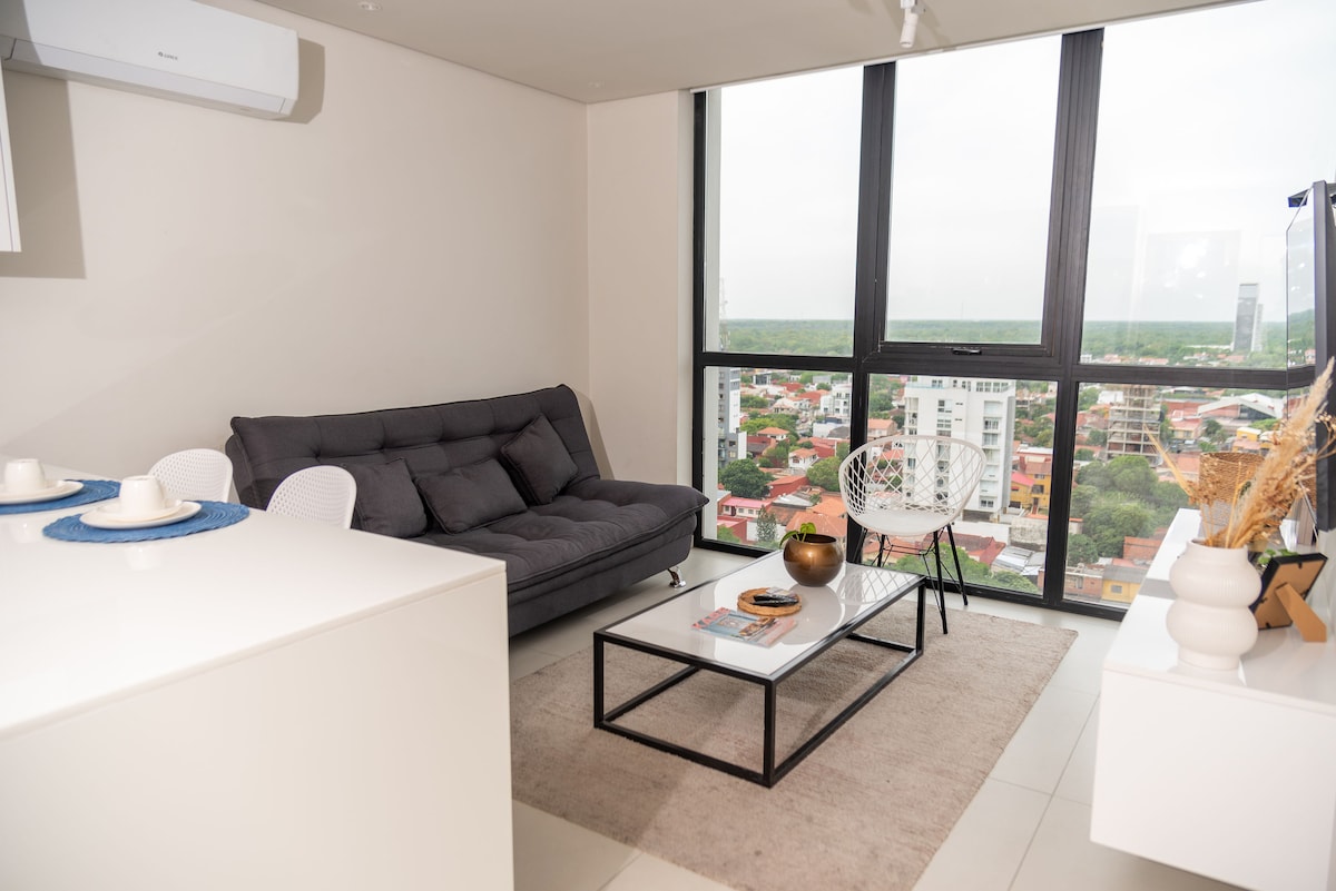 Welcome to your stylish and comfortable studio located in Santa Cruz’s most exclusive area: Equipetrol Norte — just steps from Ventura Mall, Green Tower, and Manzana 40. This studio is perfect for solo travelers, couples, business guests or even small families (up to 3 adults or 2 adults + 2 kids). Inside you’ll find: A double bed and sofa-bed, divided by a sleek glass-block partition for privacy A fully equipped kitchen with oven, cooktop, microwave, and cookware