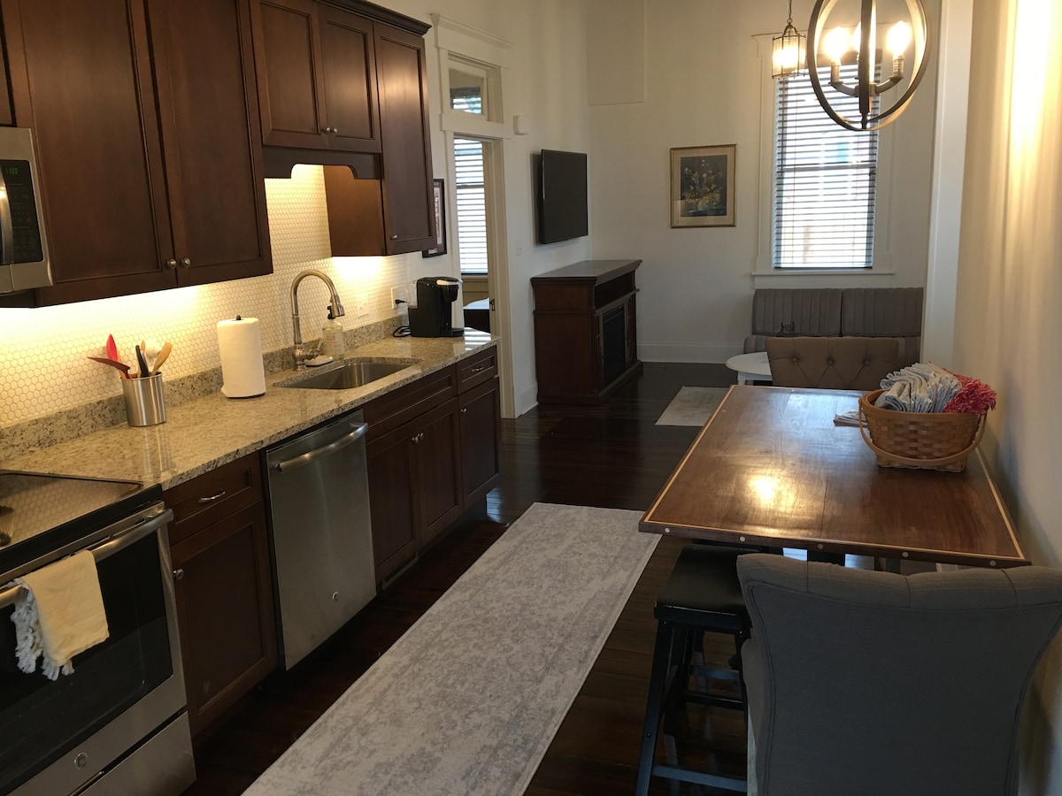 Perfect for your getaway! Stay in the historic F.G. Henneke building in Owensville, MO's historic Hub district. Apartment B is a comfortable 1 bedroom ground floor hideaway apartment, accessed from your own private off-street entry. 560sf unit completely renovated with new appliances, windows, and the restoration of original floors, millwork, and ceilings. The unit retains the building's historical 1907 charm and warmth, with the amenities and comforts we expect in the modern world.