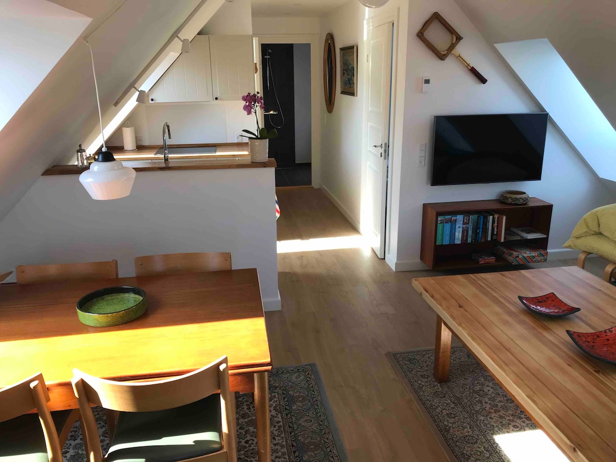 In the middle of beautiful Allinge is this cozy 1st floor apartment with its own entrance and access to a small garden. The stairs to the 1st floor are a little steep. 2 bedrooms, 1 bathroom, 1 living room (with the possibility of 2 extra beds) and kitchen with dining area. The apartment has a shed in which you can possibly put your bikes. The apartment is centrally located in Allinge town, close to various restaurants, so the sound of partying people can be heard in the summer months. Pets, smoking and parties are not allowed in the apartment.