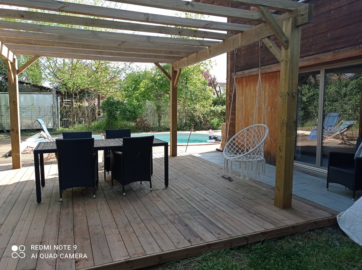 At the gates of BAYONNE (5 Km) and 2.5 Km from the Landes beaches, less than 20 minutes from Capbreton, Hossegor or Biarritz, highway 5 minutes away, we offer our house for weekly rental. Located in a very quiet area, modern and intimate house overlooking the forest. A small heated pool (10 m²) with a sliding terrace that secures it, neat and well-equipped exterior.