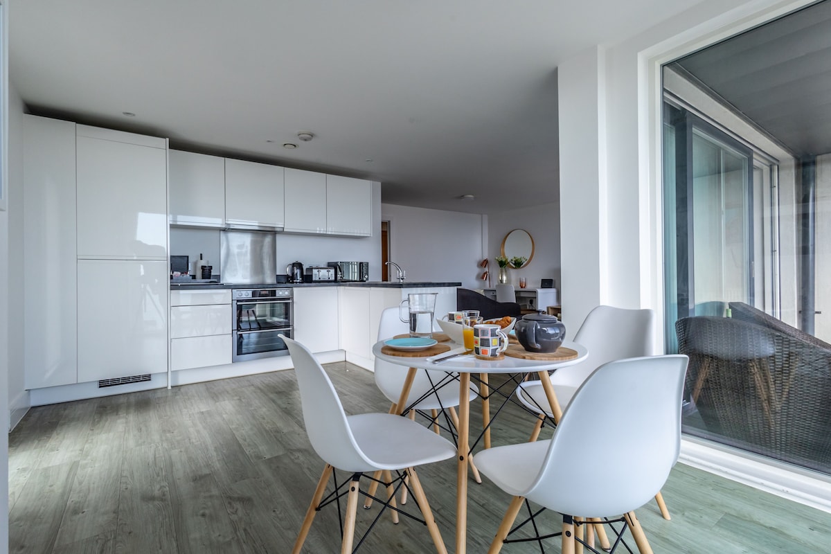 Enjoy your perfect getaway in this award winning 2 bed penthouse apartment with 180 degree sea views in the heart of the tranquil Alum Chine area of Bournemouth just a few minutes walk from the beach. The property boasts two dining areas, one of which sits on the large balcony with views across Bournemouth beach and a bespoke wood burning stove for the winter nights. The open plan kitchen leads onto a cozy living room where you can enjoy Sky Glass TV entertainment through super fast WiFi.