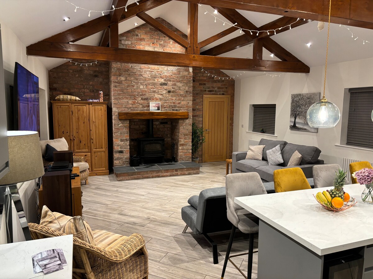 Beautiful barn retreat with hot tub and options for ~ spa treatments/massages/facials ~ private chef ~ pilates, yoga, zumba Ideal for couples, families/groups in the grounds of historic Oulton Smithy. Close to Oulton Park race circuit in the pretty Cheshire countryside. Beautiful woodland walks & country pubs nearby. The converted barn is set back from the Smithy with its own entrance, secure parking and a stunning private hot tub, it has two bedrooms & two en-suites. Luxury touches throughout.