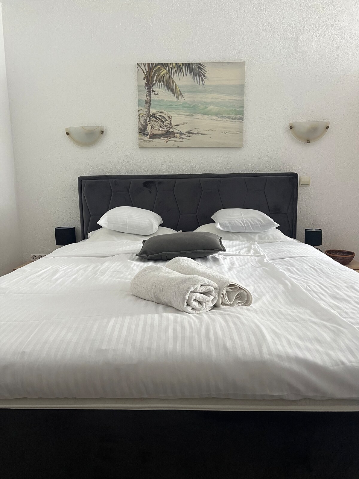 Fully furnished with modern interiors brand new apartment in the hearth of Budva! Within walking distance of day & nightlife options. Exclusive restaurants, cafes, supermarkets, night clubs, 4-minutes walking distance from waterfront promenade/beach. In the middle of all actions but just far enough where it won't affect your SLEEP. Enjoy beautiful views of the sea and the city of Budva from the private balcony. THIS IS THE PLACE TO STAY.
