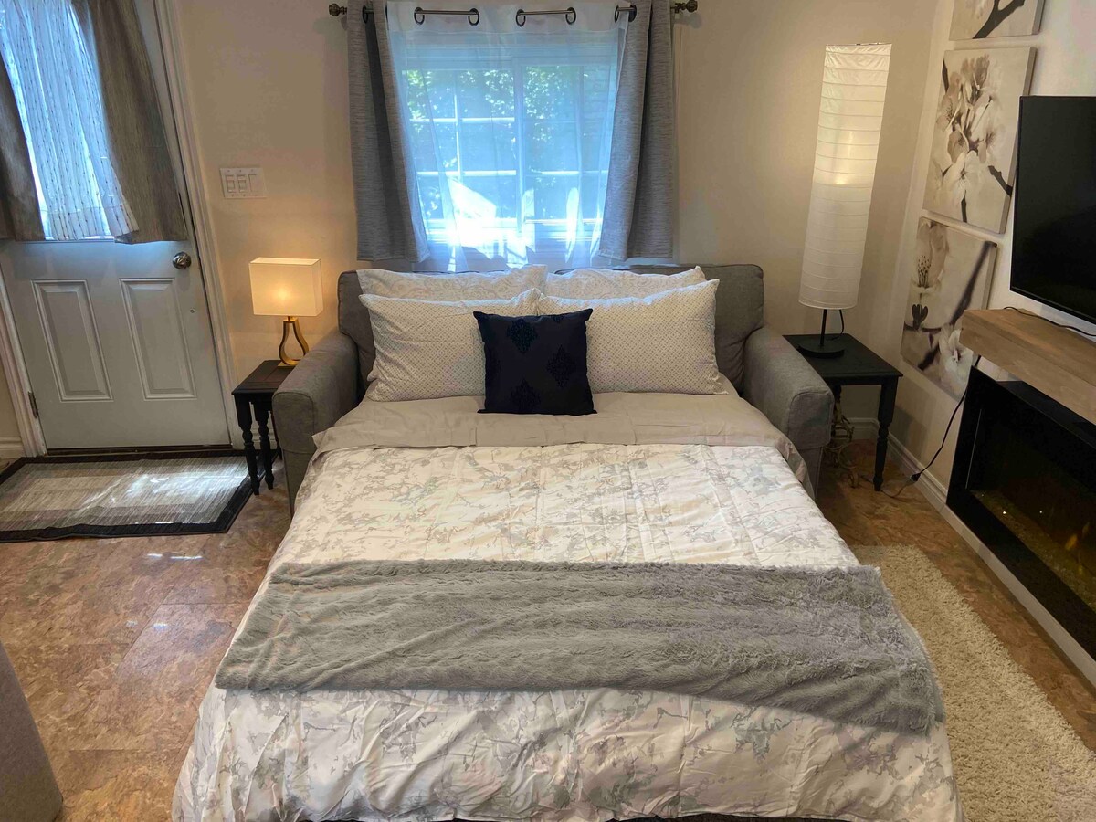 Take it easy at this unique and tranquil getaway and enjoy a delightful stay in a separate studio garden suite for your Brantford trip. The guest house is equipped with AC, heating, and WIFI to make your stay comfortable. Our guest house is less than five minutes away from Hwy access, restaurants, bars, parks, and the Wayne Gretzky Sports Center. A great location for you to discover Brantford the best way. We look forward to hosting you!