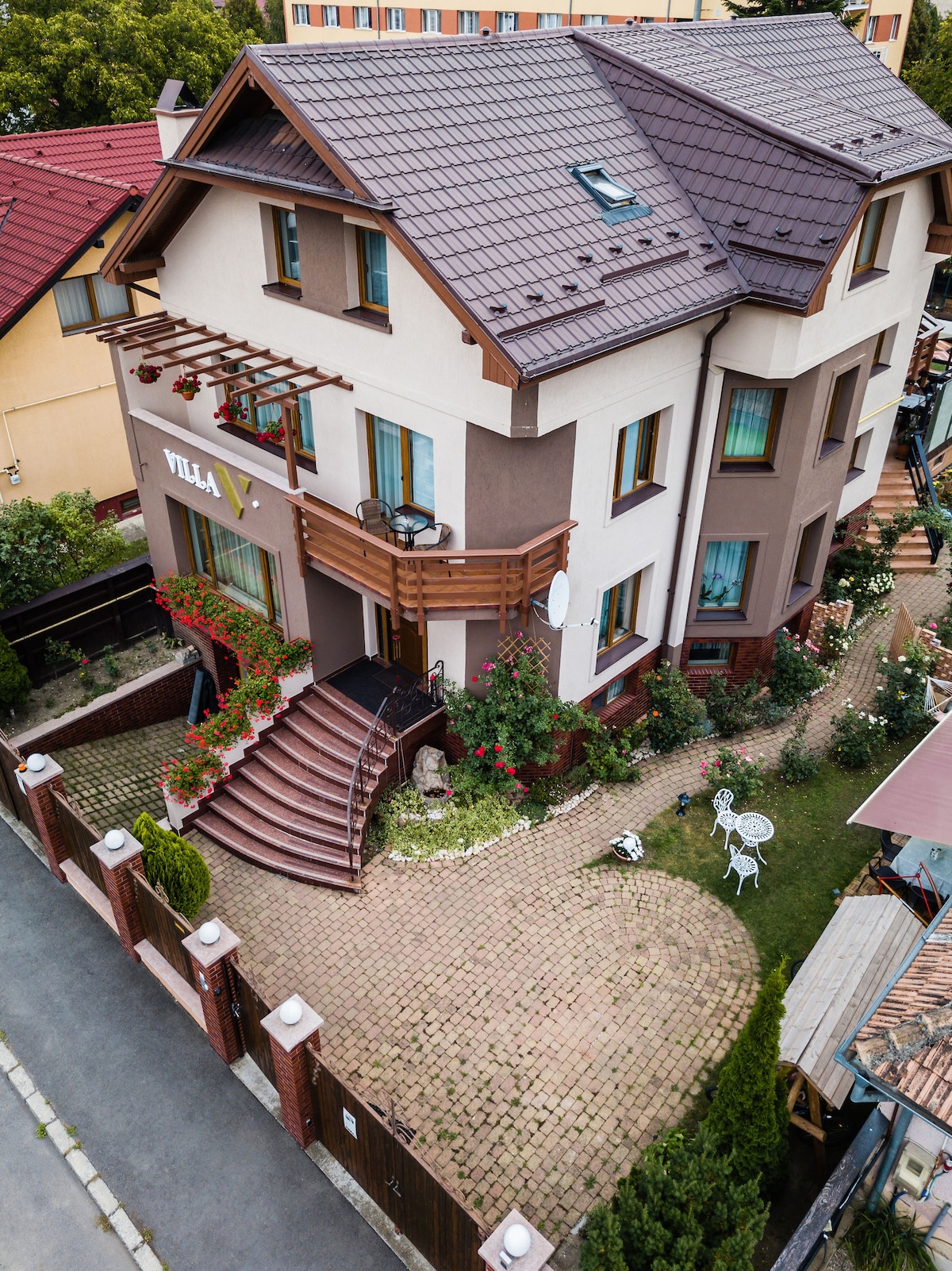 Villa V has 3 standard rooms and 2 apartments. The rooms are beautiful, bright and intimate. What you will find here? From bright rooms, a zen attic, a cozy garden, a bright lounge with fireplace, varied options for a delicious breakfast, an authentic wine cellar and many ideas for spending your time in the story town. Our goal is that every guest should leave with a beautiful memory linked to the city of Brasov and we want you to come back with love.