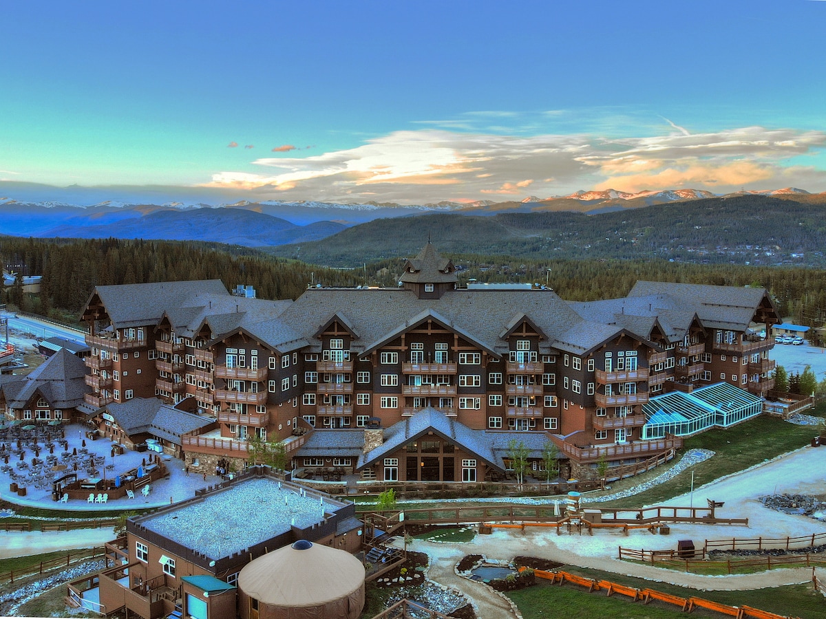 Ski-in/Ski Out Grand Colorado on Peak 8 : 1 bedroom 2 bathroom 900 square feet, one-bedroom feature a king bed in the master bedroom, a queen sleeper sofa in the living room, flat-screen TVs, a fully equipped kitchen, fireplace, balcony and a washer/dryer Indoor/outdoor pools and hot tubs, children’s pools and a water slide, 5 Private Movie Theaters, Lobby Bar, Game room, restaurants on site, Infinity Spa and the adult-only grotto, Rooftop patio, outdoor grills, Ice Rink