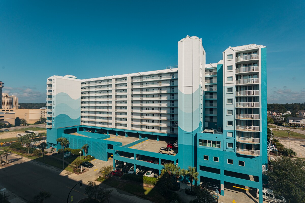 This Beautiful 1BR, 1BA Oceanfront Suite, sleeps 5 and is very spacious. 1st floor with private balcony and stunning Oceanfront view. 1Br with King bed, living room has a pull down murphy and sofa sleeper. Granite counters in both kitchen & bath with a large shower and full efficiency kitchen. 2 TV's, wifi, Iron, blow dryer, 2 pools indoor/outdoor, 2 Jacuzzi's indoor/outdoor, lazy river, lawn chairs/umbrellas and a quick walk to the beach. Ask about our honeymoon/anniversary packages we offer.