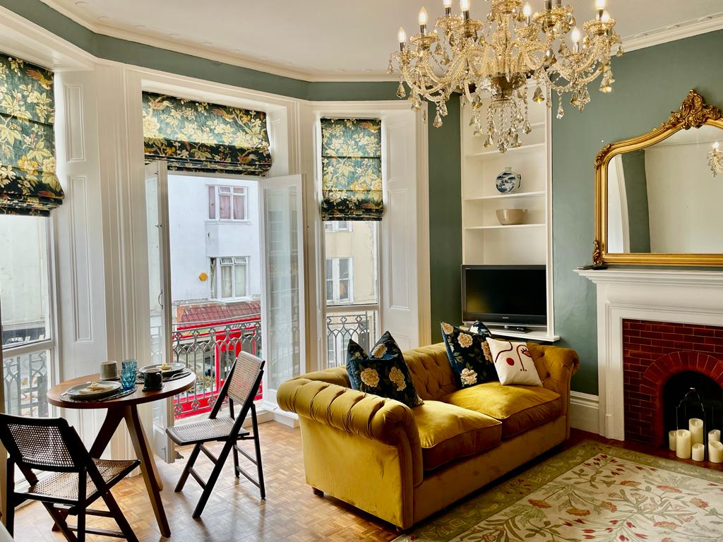 Enjoy an amazing stay in our gorgeous, centrally-located, first floor, balcony flat, set in a converted Regency building in Brighton's trendy Kemptown. Light floods in through 3 full length windows, which look out to sea. The flat has an accessible balcony; is full of original features: high ceilings with decorative plasterwork, fireplace & the original wooden shutters; as well as GCH, open plan, well equipped, kitchen, smart TV, newly fitted walk-in shower (no bath) & a cosy double bedroom.