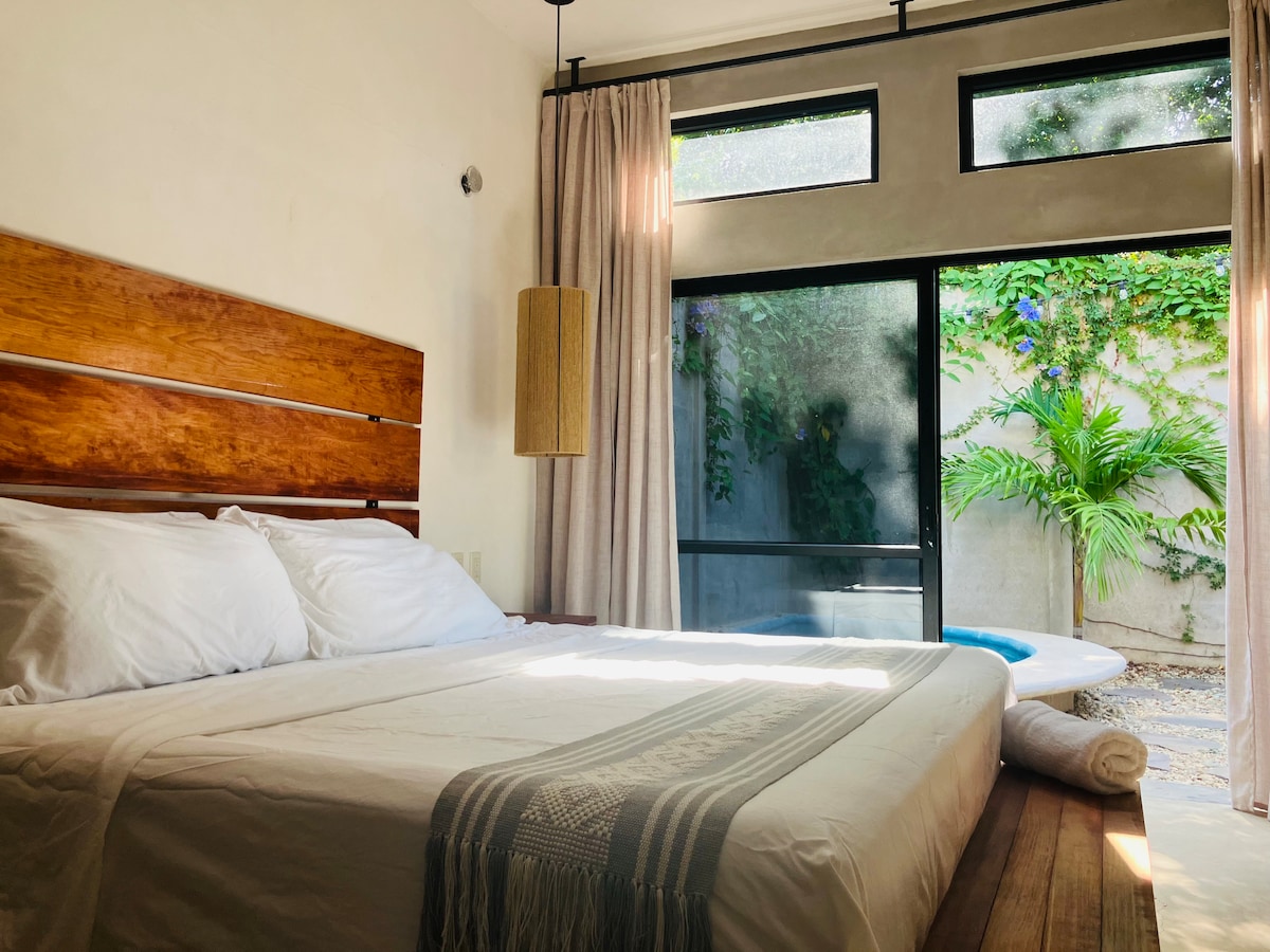 Beautiful and spacious suite with king-size bed, 50" swivel TV, air conditioning, kitchen, bathroom, and private pool. Feel the tranquility, relax in the whirlpool of your private pool and enjoy the comfort of having everything you need for a pleasant stay. We are located in Punta Zicatela, a 7-minute walk from the beach, the main surfing spot, restaurants, bars and shopping area. Close to everything, but away from the hustle and bustle of the party. We have Starlink Internet