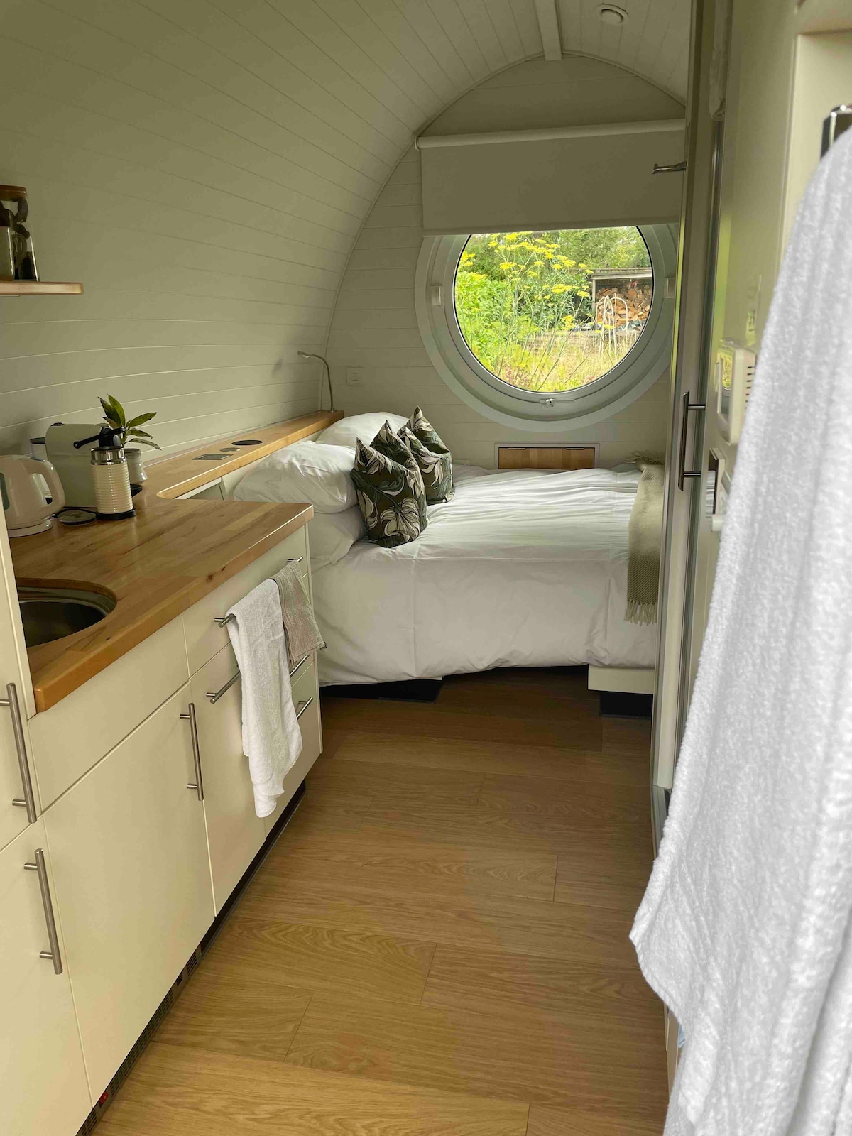 The Armadilla is a unique, self contained Pod at the bottom of our quiet large garden. It’s located just a short walk from the mainline station, village centre shops and restaurants. Handbuilt in Scotland by craftsman the Armadilla has a kitchen, the 2 sofas can convert into single beds or a king size bed, there is a wetroom. Underfloor heating and filtered air keep the place warm, cosy and clean. We have secure off road parking for one car.