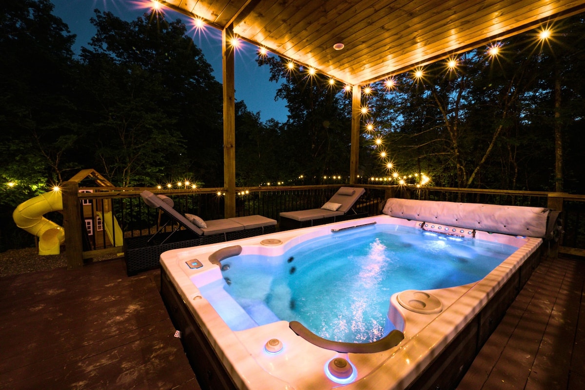 Swim, soak & play in your secluded swim spa pool (NO POOL HEATING FEES!), bubbling hot tub and a large open deck—then unwind around the fire-pit. 💦Resort-style swim spa pool & hot tub 🛏Sleeps 10 in 2 king suites + bunk beds in loft 🕹Fun galore - swings,playset,air hockey,foosball,shuffleboard,arcade 🚘 NEMA 14-50 EV charging plug;ample parking 🔥Outdoor fire-pit & grill 🐶Pet-friendly Near trails & lake yet fully private. Book your family escape today! Fudge-tons of fun await!