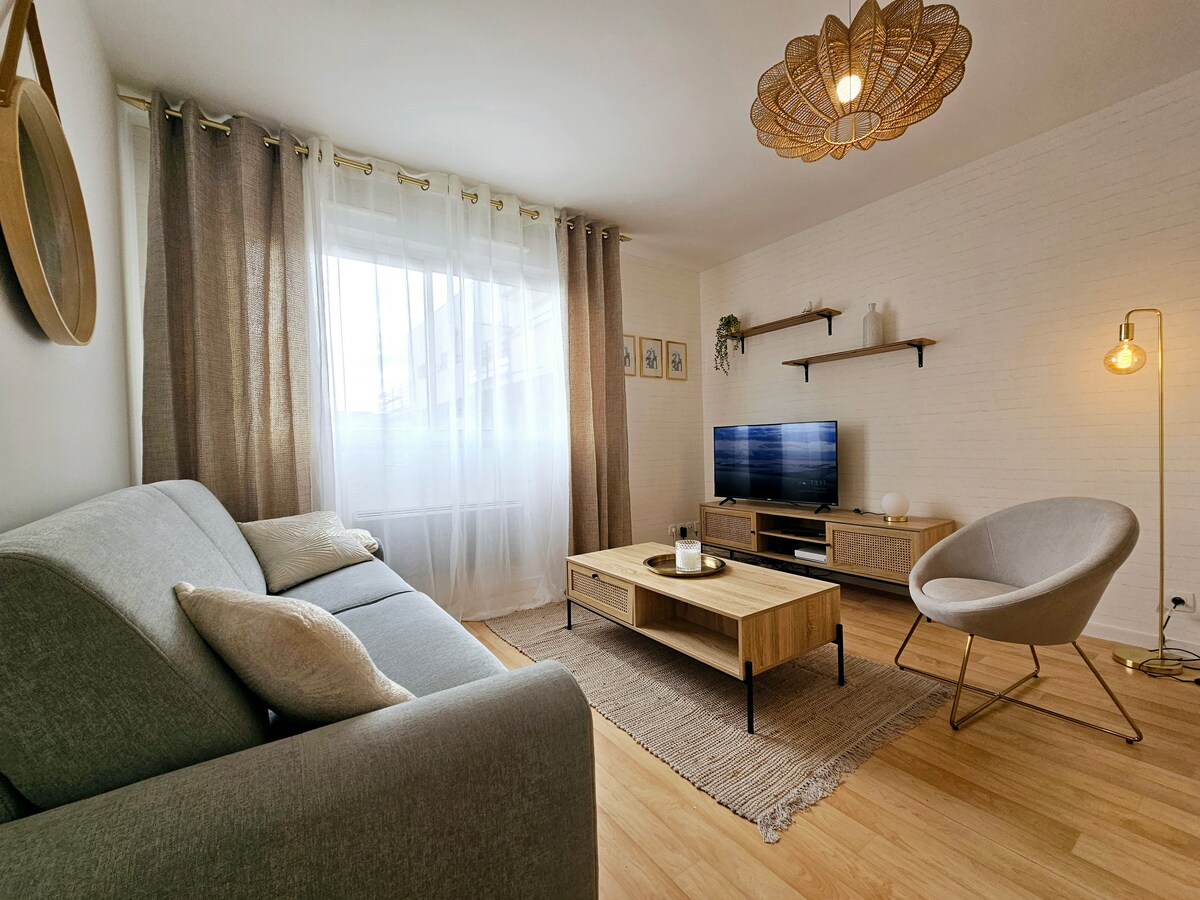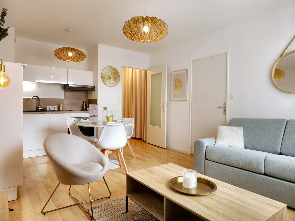 Discover our charming 2-room, light-filled apartment, with a 14 m² master suite. The refined decoration offers a soothing atmosphere, mixing clarity, golden touches and a subtle vegetal touch. Enjoy a golden break in a secure residence, close to Place du Vert Buisson, full of shops and restaurants. Ideal for business travelers or couples. Fully-equipped kitchen, bright living room, and an atmosphere inviting you to relax. Book now for a unique experience!