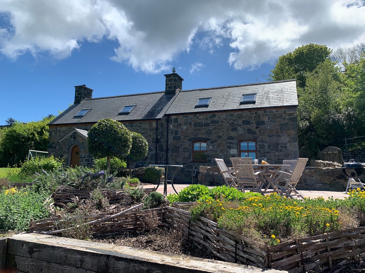 A lovingly refurbished characterful and romantic one bedroom cottage with an edge of luxury in the heart of the Snowdonia National Park. Amazing views of the beautiful Cardigan Bay and the Lleyn Peninsula and in close proximity to award winning beaches. Set in peaceful countryside and full of original features. Enjoy cosy evenings in front of the dual aspect wood stove or soaking in the extremely relaxing wood burning hot tub whilst taking in the views or gazing at the stars.