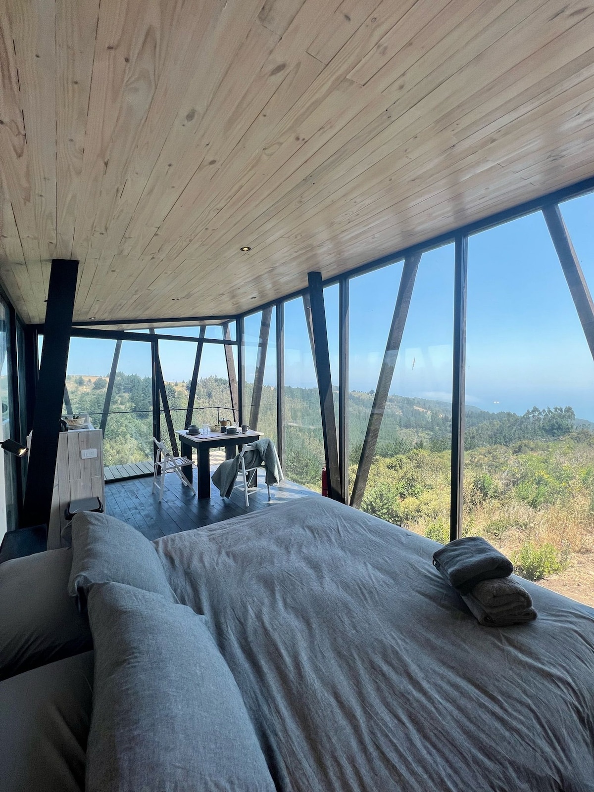 Experience the Maule coastline like never before. Oceanfront view with a 14 meter-long fully glazed facade with floor-to-ceiling windows that make the view a 24-hour show. In case you need some more sleep just roll down the black-out curtains and you’re good. The loft features 1 double bed, sofa bed, south-wind protected terrace, Starlink internet, fully equipped kitchen and a stylish stone and wood bathroom. 10 km south of Curanipe, 300 meters from the main road and steps from the beach.