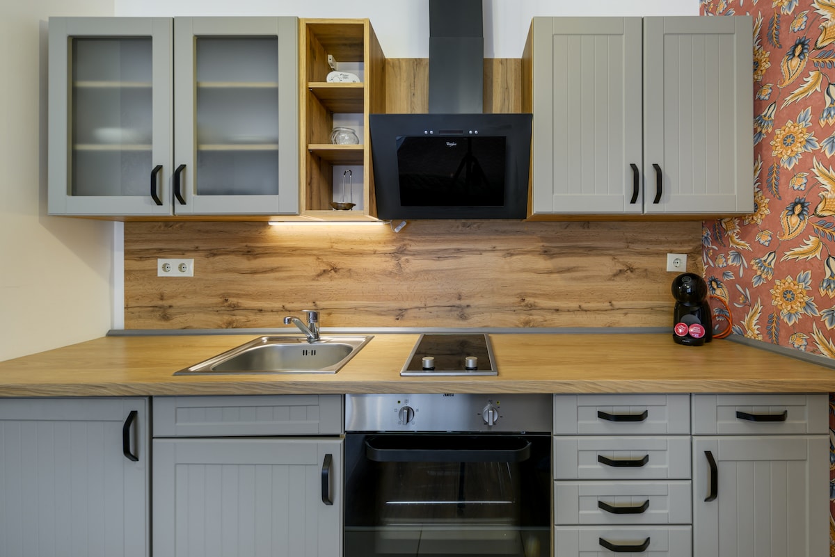 This newly updated modern studio was thoughtfully designed to create the perfect space for today's traveler. The minimalistic design provides a comfortable space to relax after a memorable day in our historic city. All guests will be welcomed with a nice bottle of Hungarian wine. The apartment is situated on the 5th floor, the elevator goes until the 3rd floor thus you have to climb 2 levels in a narrow staircase. Internet speed: 250 Mbps
