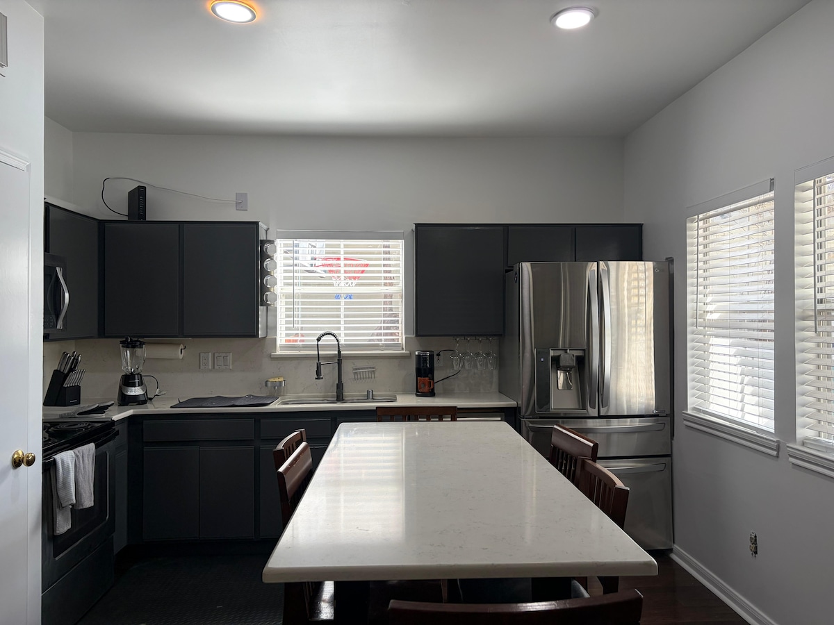Clean home, beautiful decor, original artwork, gated parking/EV, central arts‑district location, fast WiFi. Enjoy luxury comfort in a central location near downtown Houston. • 5 min drive to downtown • 10 min to Galleria • 15 min to Medical District • Gated driveway • Full kitchen with cooking tools • Crib/high‑chair • 1 Gb/s fast internet • YouTube TV w/ ESPN, NFL Network, CNN, Univision • 65" TV in the living room and a TV in each room • Complimentary toiletries • Rain-shower "spa bathrooms"