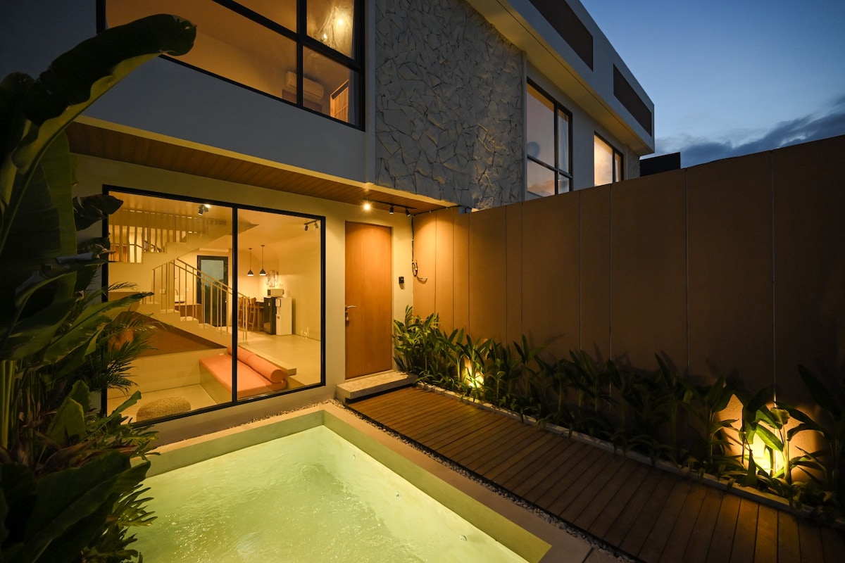 Enjoy your romantic private times in a luxurious complex, close to a fine selection of world-class cafes, restaurants and beach clubs. But perfectly hidden in a serene and quiet villa neighbourhood. This villa features an ensuite bathtub and offers a perfect dip-in pool. Enjoy your floating breakfast under the wood panels with sunlight gently pouring through. Chillax on the bean bag or sun loungers at your choice while soaking up the view of the garden.