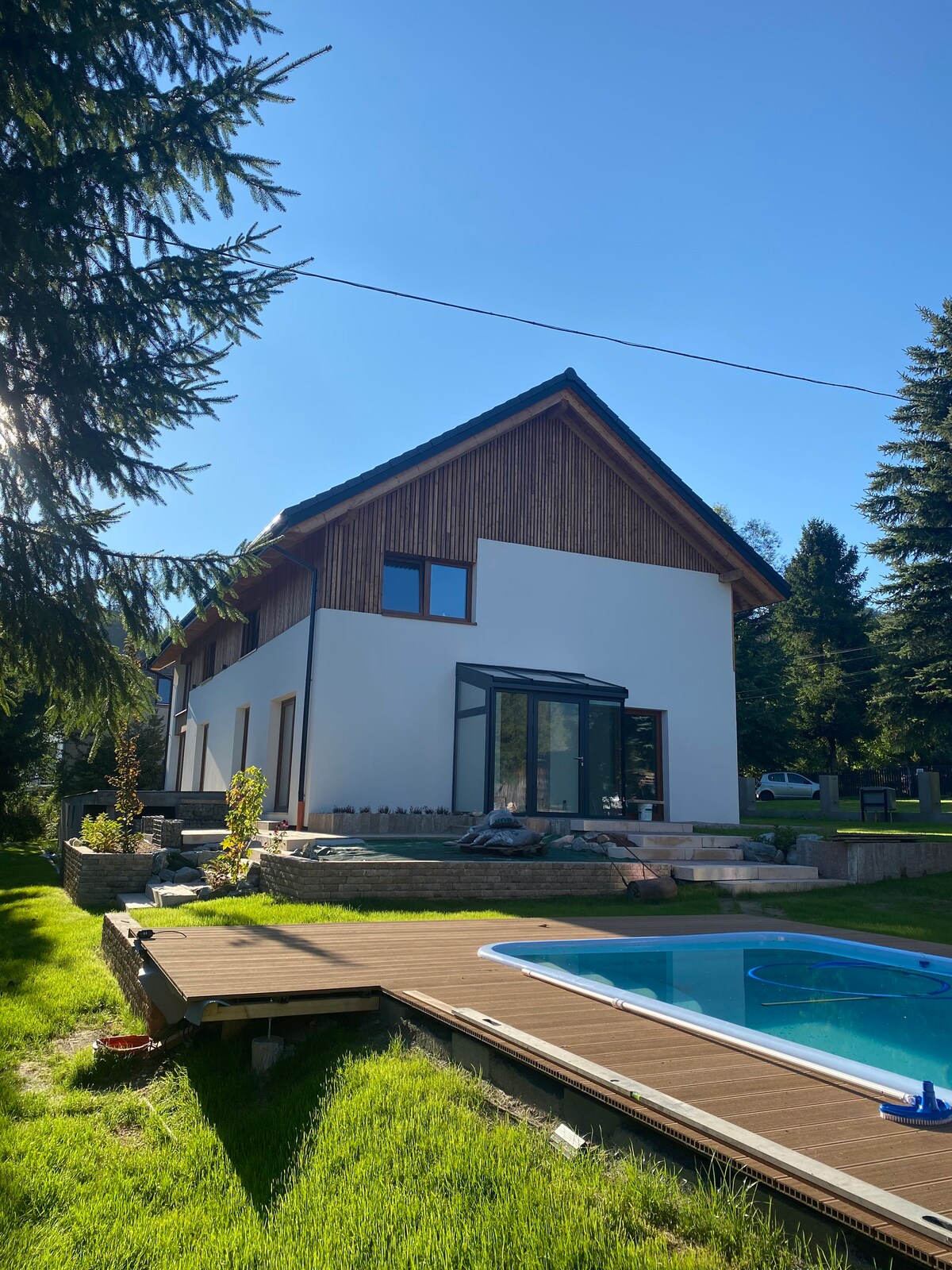 Postavené vlastnými rukami od základov až po ručne vyrobený nábytok interiéru. Upravené okolie domčeka pre Vaše pohodlie: terasa s lehátkami a vaničkami na kúpanie v lete, kaďa s vyhrievanou vodou na jarné a jesenné dni, vonkajšie posedenie na čiastočne krytej terase vedľa malého rybníka, priestor na grilovanie či opekanie. A všade navôkol vysadená zeleň. Záležalo mi na tom, aby hostia zažili kvalitu a komfort na pohľad aj na vlastnej koži.