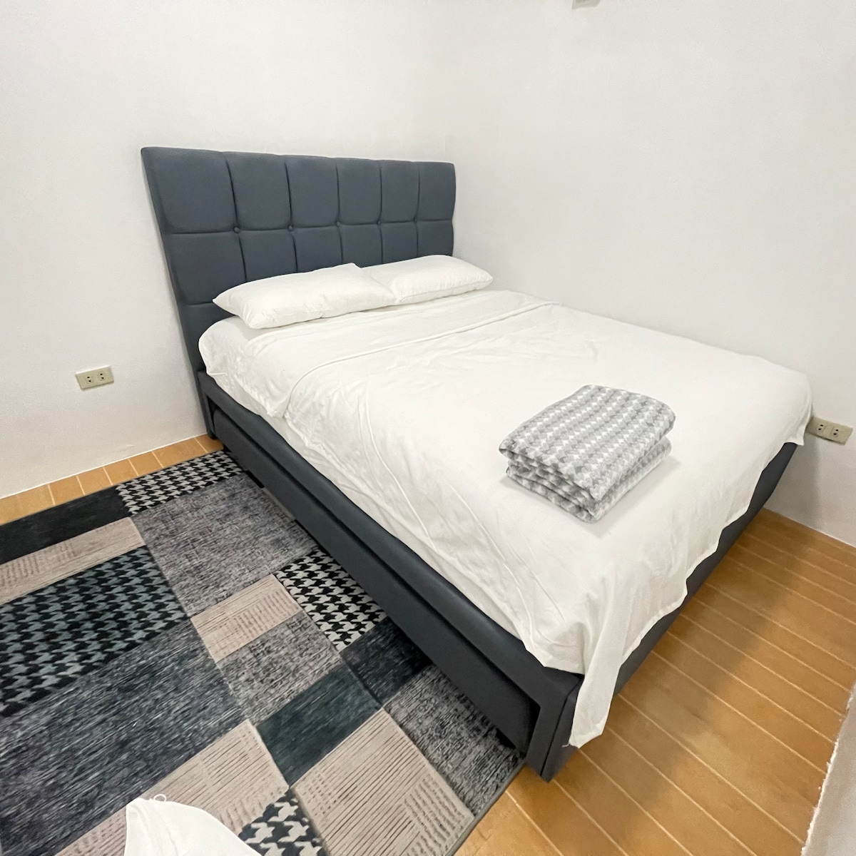 Freshly remodeled, clean and quiet apartment in San Pablo Malolos Bulacan. Centrally located just off of McArthur highway. Easy on off of NLEX Balagtas exit, 25 minutes to Philippine Arena, 10mins to DPWH, walking dist. to S&R, 10mins to Robinson's Mall by car. 2 cars free parking, keypad entry. Study table, TV, AC in bedroom upstairs with full size bed for 2, bedrm downstairs has a bunkbed with a fan on each. Ceiling fan in living room, larger fridge, shower heater, elec. stove & utensils.
