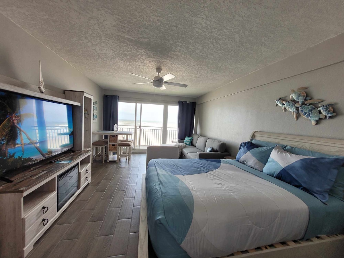 We are located on Daytona Beach a 1 minute walk through the pool area to be on the beach POOL IS OPEN AND INDOOR POOL IS OPEN Kick back and relax in our newly remodeled calm and stylish space. we have a full size refrigerator, you will fall in love with our balcony views. we have all pots and pans and kitchen supplies. all linens and beach towels included. we have 1 king bed and a futon couch big enough for 1 adult or 2 small children.