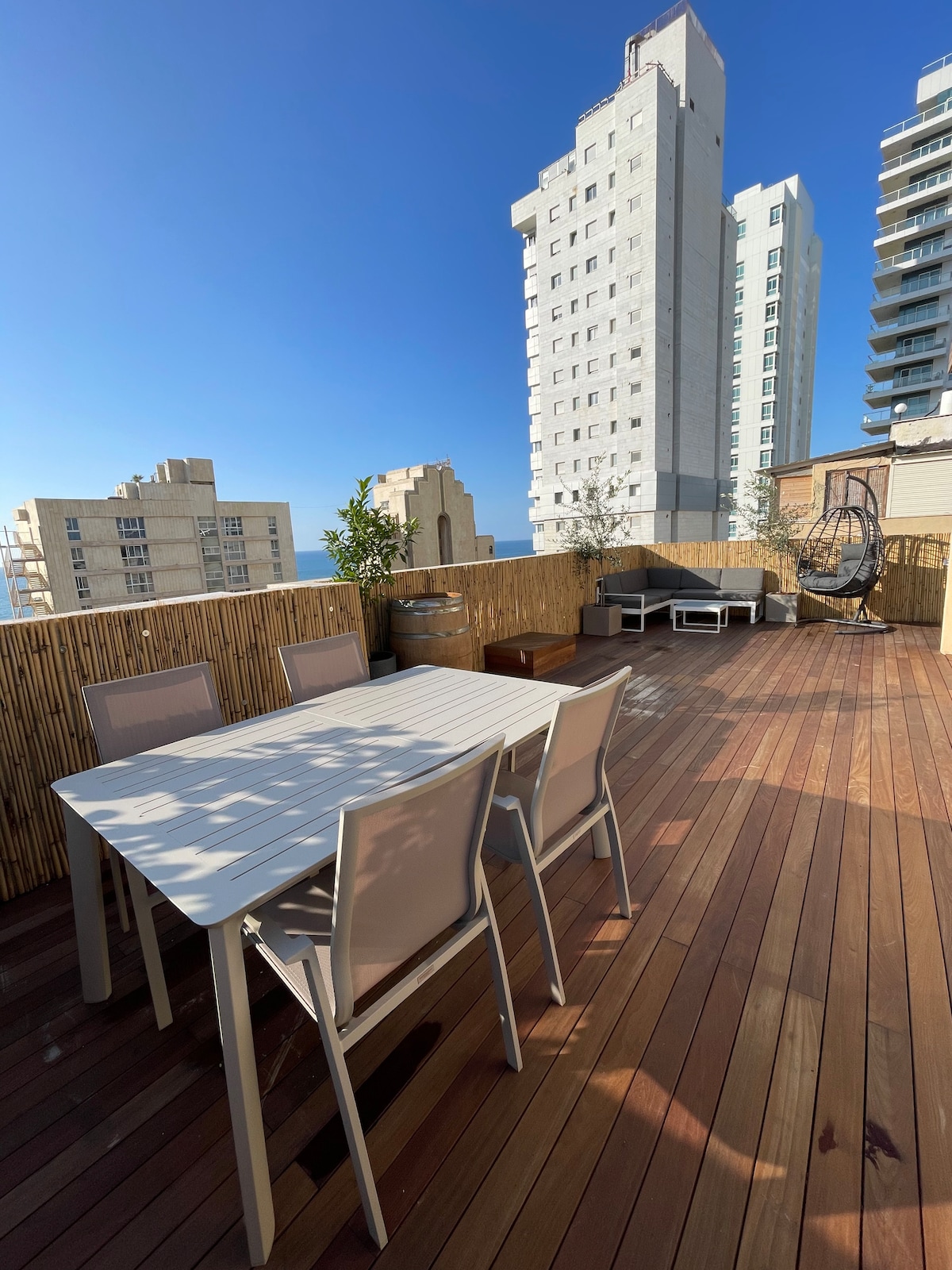 Roof Top 3 floors Penthouse, specially tailored for unforgettable vacations. comfortably accommodating groups of up to 20 people, with everything you need for a perfect stay. Prime location. just a few steps from the sea. Kosher buy demand, Great for Shhabat observes. Huge Ipea deck terrace with sunbeds and seating area. Nothing similar to this penthouse in the area! 1-minute walk from the Kikar (main square of Netanya) Book now with low fares, it won’t stay for long