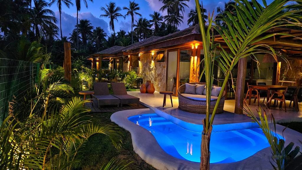 Have an elegant experience at the charming Chalet in Morro de São Paulo. The sophisticated accommodation, with an ofuro and sea view, is considered one of the best lodgings on the island, as its location is a strong point, being less than 2 minutes from the sea at Primeira Praia and close to shops, a market and commerce in general.
