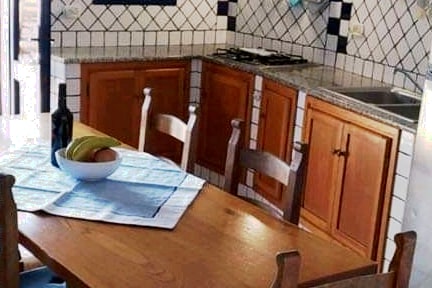 80-square-meter house with a large and equipped garden. It includes a large living room-kitchen with fireplace, a double bedroom and a double bedroom (triple if necessary), a large bathroom with shower. On the outskirts of the village, along the road that leads to the Su Anzu spa and the beaches of Osalla and Cartoe. Ideal for families.
