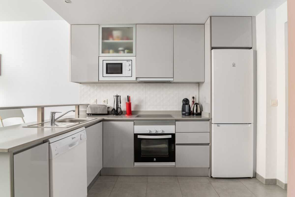 Very quiet residential area, with a swimming pool and garage, 2 bedrooms with a double bed, a bathroom with a bathtub and a toilet with a shower, a full kitchen and a living room. Terrace with table and chairs, and the best for last... a solarium terrace, with chill-out area, hammocks and pergola! To spend unforgettable sunsets... An apartment with taste and all the details, close to the beach and beach bars. Tourist villages 4 min away, pristine coves and beaches nearby