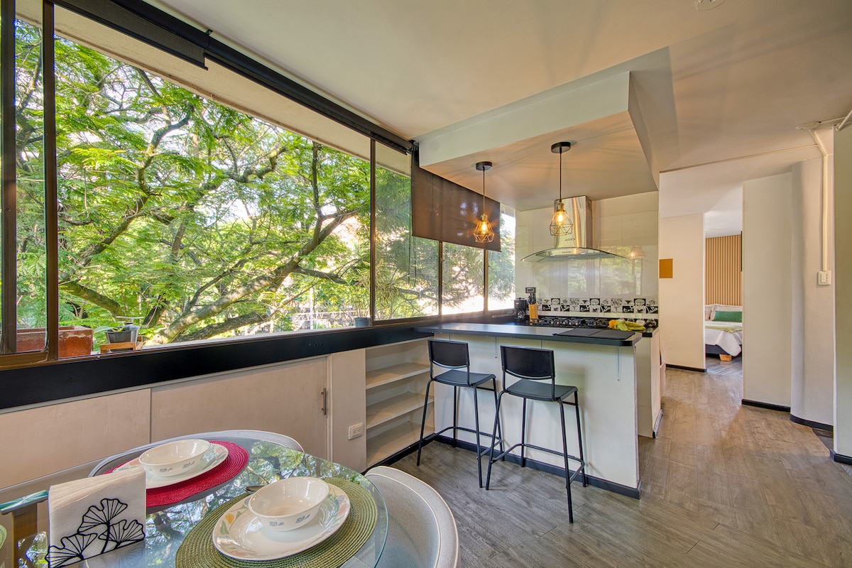 Granada 17.22 | Boutique Stays Enjoy Cali in this 63mt2 apartment in Granada, the best "Zona Rosa" (lively area). Modern and luxurious design offering 100% autonomous access, guaranteeing your privacy and security. AMENITIES: Equipped Kitchen Fiber Optic WiFi Desk A/C Smart TV Queen Bed Hot Water 2 Bathrooms Sofa Bed Ideal for couples, friends, or family. Immerse yourself in the cultural and gastronomic life, bars, and shops at hand. Just minutes from Boulevard del Río and La Ermita Church.