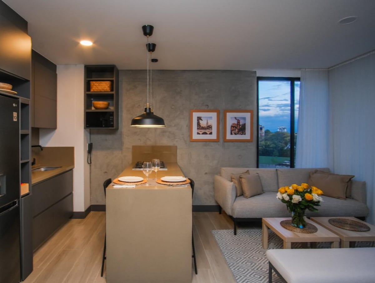 Granada 17.22 | Boutique Stays Enjoy Cali this 63mtr2 apartment in Granada, the best "Zona Rosa" (lively area). Modern and luxurious design offering 100% autonomous access, guaranteeing your privacy and security. AMENITIES: Equipped Kitchen Fiber Optic WiFi Desk A/C Smart TV Queen Bed Hot Water 2 Bathrooms Sofa Bed Ideal for couples, friends, or family. Immerse yourself in the cultural and gastronomic life, bars, and shops at hand. Just minutes from Boulevard del Río and La Ermita Church.
