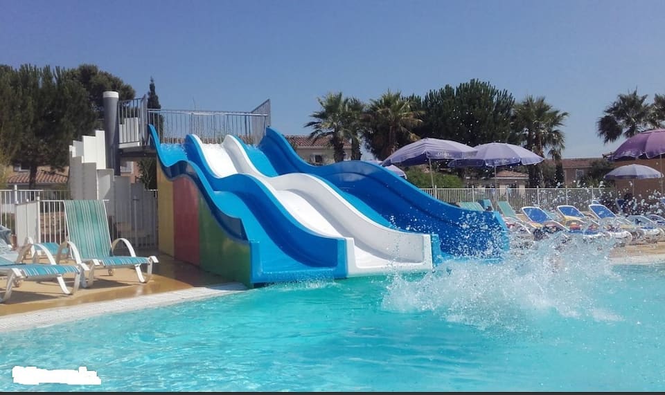 34 m2 accommodation ideal for family vacations. In the "Mas des Vignes" area. Living room with kitchen, shower room, large bedroom that can be divided by a curtain creating 2 sleeping areas. Nice terrace not overlooked. 1 beautiful sunny swimming pool and a heated swimming pool year-round. Numerous amenities (tennis court, ping-pong, petanque courts, restaurant/bar in summer, etc...) Free parking in the residence. 25 min to the sea.