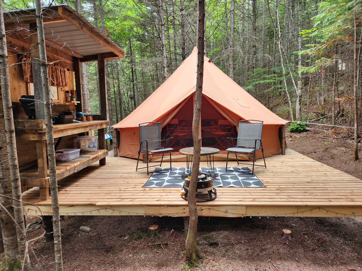 Reconnect with nature in Selke - a spacious 16' bell tent located at Tír na nÓg, an off grid camping escape owned and operated by Jake's Restigouche Outdoor Adventures. Nestled within a forest of fir, poplar and birch trees along the Restigouche River in Mann Mountain, NB. Selke brings nature to your doorstep! Her rustic barnwood kitchen, cook stove, outdoor shower, firepit, queen bed, and more are guaranteed to ensnare you. Camping has never been this magical. Come to the Forest!