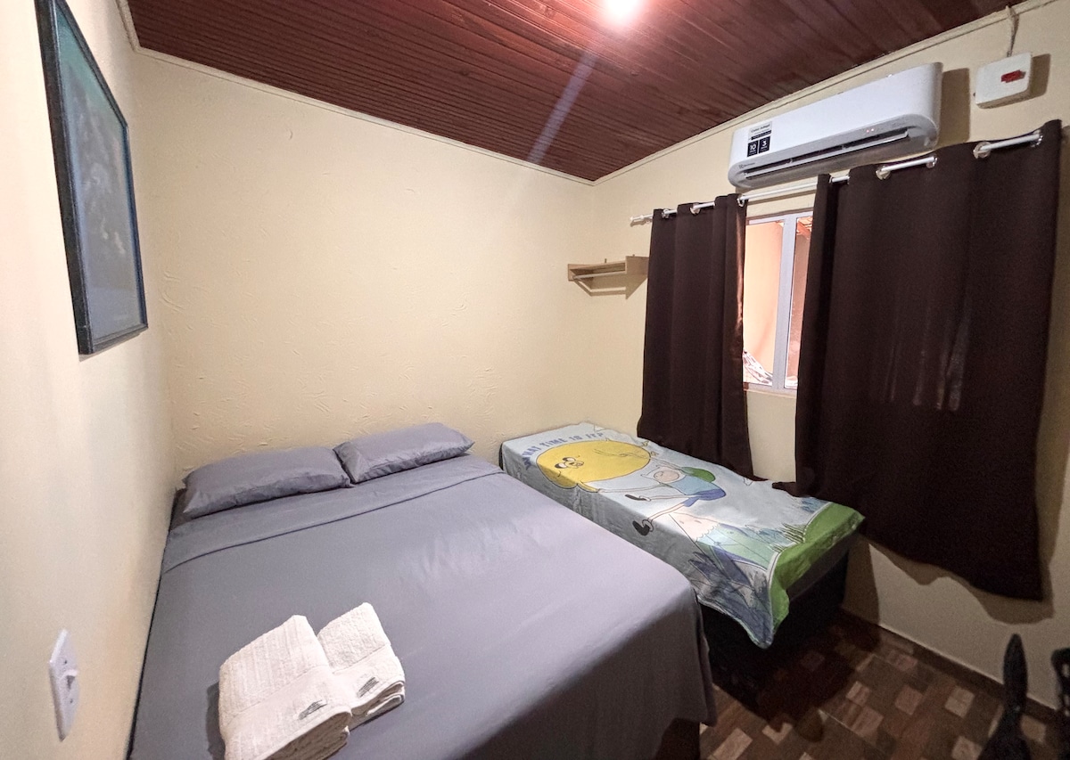 ENTIRE AEDICULE. Hosts live in the same yard, in front. The accommodation is safe/quiet. It's close to the airport, at the exit of Bonito/Pantanal. Next to the army and IFMS. It's easy to get downtown! There is no air-conditioning, but there are fans. It has a concertina and cameras, but none film the accommodation. The host's house is in the same yard, but the cottage is in the back, reserved. NO VISITORS and NO PETS. PLEASE NOTE: You need to include everyone who is sleeping in the reservation.