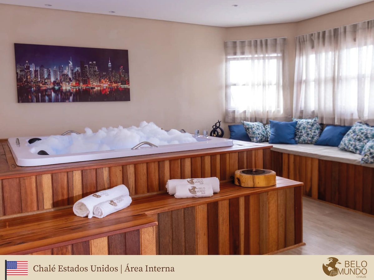 Descubra o mundo sem sair do lugar no Belo Mundo Chalés! Este chalé é inspirado nos Alpes suíços e possui café da manhã incluído, entregue diariamente em uma cesta de piquenique. O chalé possui ar-condicionado quente e frio, cama queen, sofá-cama na sala, cozinha equipada, sala de jantar, banheira com uma linda vista e uma incrível sacada privativa para contemplar o por-do-sol. Contate-nos para solicitar pacotes de decorações para datas especiais.