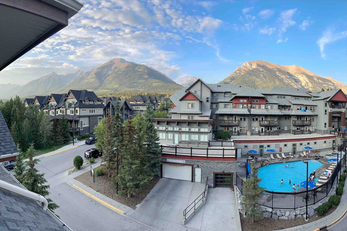 Top floor 1 bedroom suite offering stunning views of Lady Mac & Grotto Mountain from a private balcony: - 15 min walk to downtown Canmore - 15 min drive to Banff - Free High-speed Wi-Fi & Cable - Free Banff Park Pass - Heated Underground parking with EV chargers - Master bedroom with King Bed, walkout to balcony - Living Room with fireplace, TV & a plush couch that can easily be pulled out into a queen bed - Full access to Resort shared amenities like heated pool, 2 hot tubs & BBQ/Patio area
