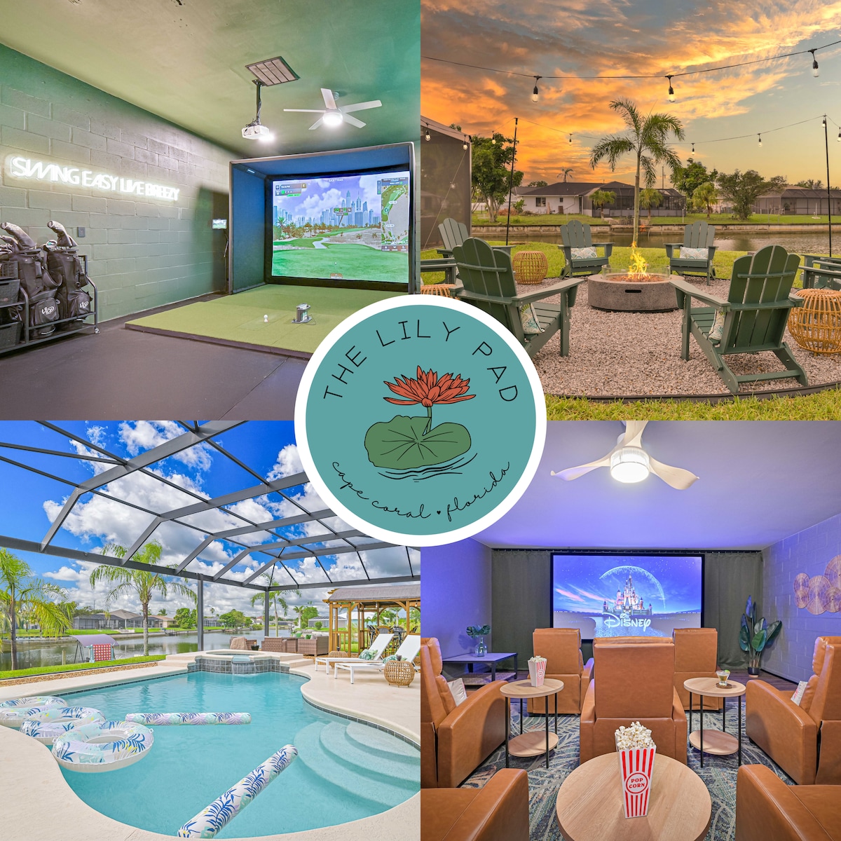 Discover your slice of paradise at The Lily Pad, a bright and breezy tropical getaway nestled along the peaceful freshwater canals of sun-soaked Cape Coral, Florida. Designed with families, friends, and adventurers in mind, this 4-bedroom, 2-bath retreat offers unforgettable experiences for guests of all ages—whether you're kayaking at sunset, challenging your swing on the indoor golf simulator, watching movies in the private cinema, or just soaking up the Florida sun by the saltwater pool.