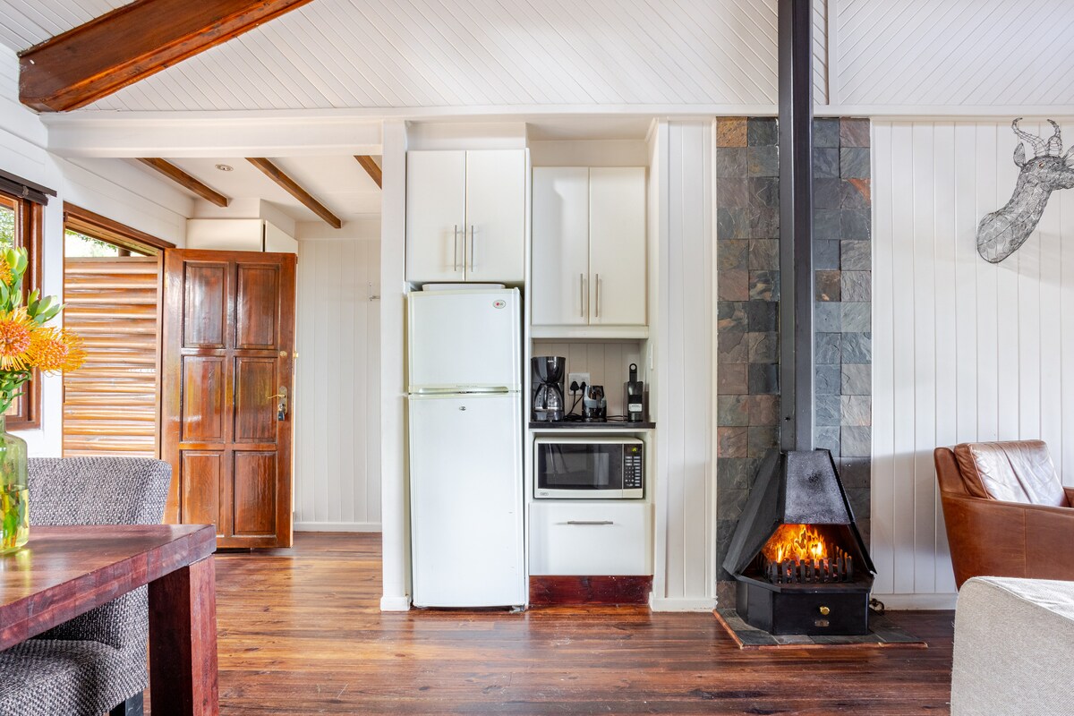 Power backup system. Wood fired hot tub. Perfect Cape Peninsula luxury hideaway. A combination between modern chalet, tree house, hotel room and cabin. Completely immersed in between age old Forest trees, surrounded by ferns, Bamboo and other plants we find our unique Granite Forest Chalet. With modern, luxurious, high quality finishes, this 60 square meter, one bedroom chalet is the perfect getaway for couples, or singles. Two decks and a home office complete the perfect getaway.
