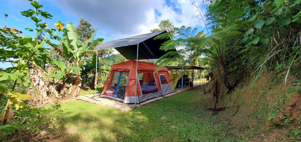 Deux tentes vous attend : une pour dormir avec un vrais matelas queen-size, une autre avec un salon et des espaces de rangement. Et entre les deux, votre coin repas privé. Niché sous les cacaotiers, à seulement 20m de la piscine pour des plongeons rafraîchissants. Douche en plein air et cuisine au bord de la piscine avec barbecue inclus ! Il y a un ventilateur à batterie, un générateur solaire pour brancher vos appareils, des lampes solaires et le WIFI. C'est du camping tout confort!