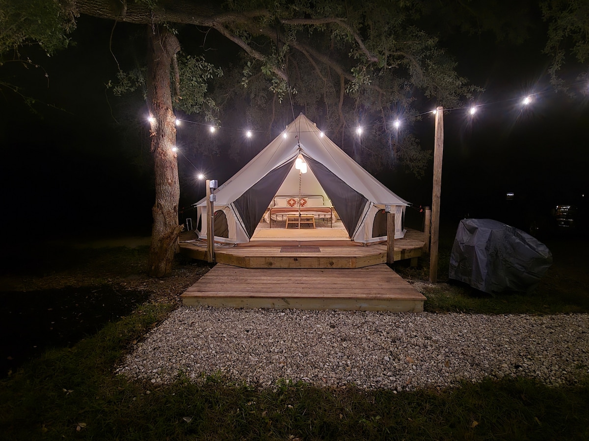 Unwind at Serenity Acres, your private glamping retreat, nestled amidst 10 acres of woods and fields. Enjoy Florida's cooler nights by the fire, and the warm sunny days. Our spacious 20' bell tent offers all the comforts of home, including a plush king-size bed, a cozy seating area, air conditioning, and heat. A full bathroom is located on the property for your personal use only, as tent guests. Shower under the moon with unlimited hot water! Relax at the fire, under the bright country stars!