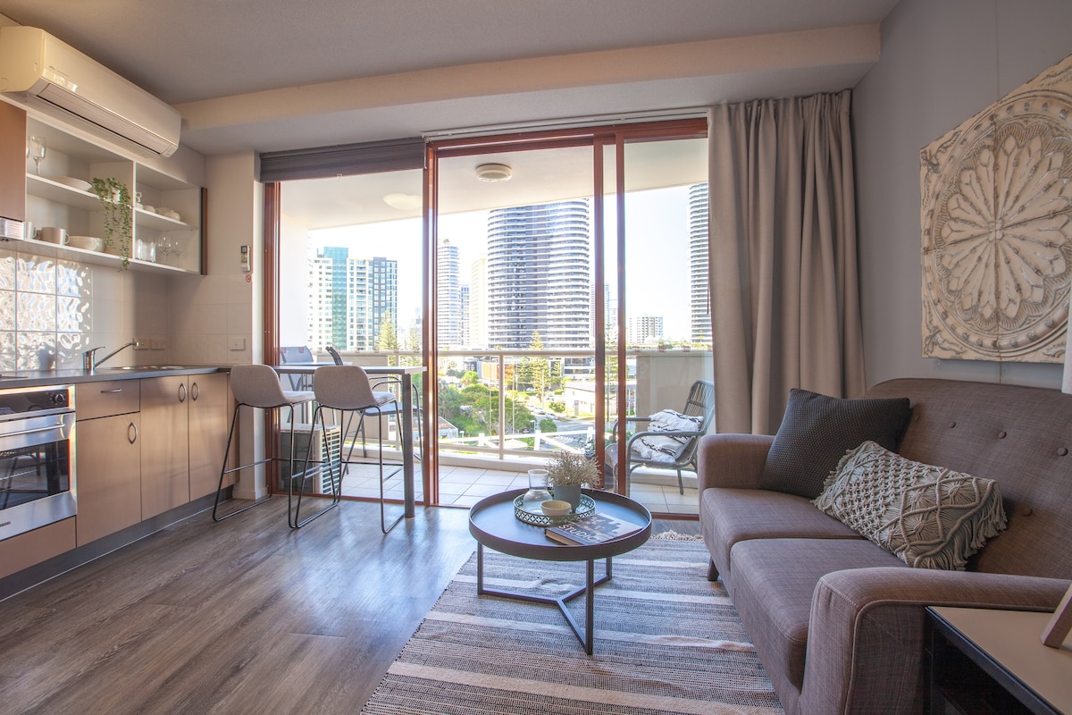 Relaxed, light filled, clean, compact yet spacious, ideally located with just a few minutes walk to all that Broadbeach has to offer. Stylish and welcoming, entire studio is offered just for two, all yours. Generously equipped, and meticulously presented. Value for money. Balcony offers spectacular panoramic Skyline City views, North East aspect, private. Full access to Resort Pool, Spa and BBQ. Free parking on first in basis. Unlimited dedicated wifi. Easy on site Self Check in.