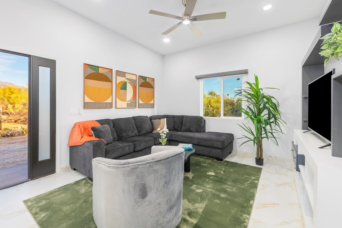 Here at the Double H Hacienda you will find a cozy and charming detached guest house with private entrances, plenty of parking (covered available). Plenty of natural light and a design that is all its own - where modern farmhouse meets the desert. It comes stocked with all the amenities you could desire including in-unit laundry and kitchen. Beautiful 360 degree views of the mountains and Tucson's breathtaking sunsets from anywhere on the property. Equine Experiences available for all guests!