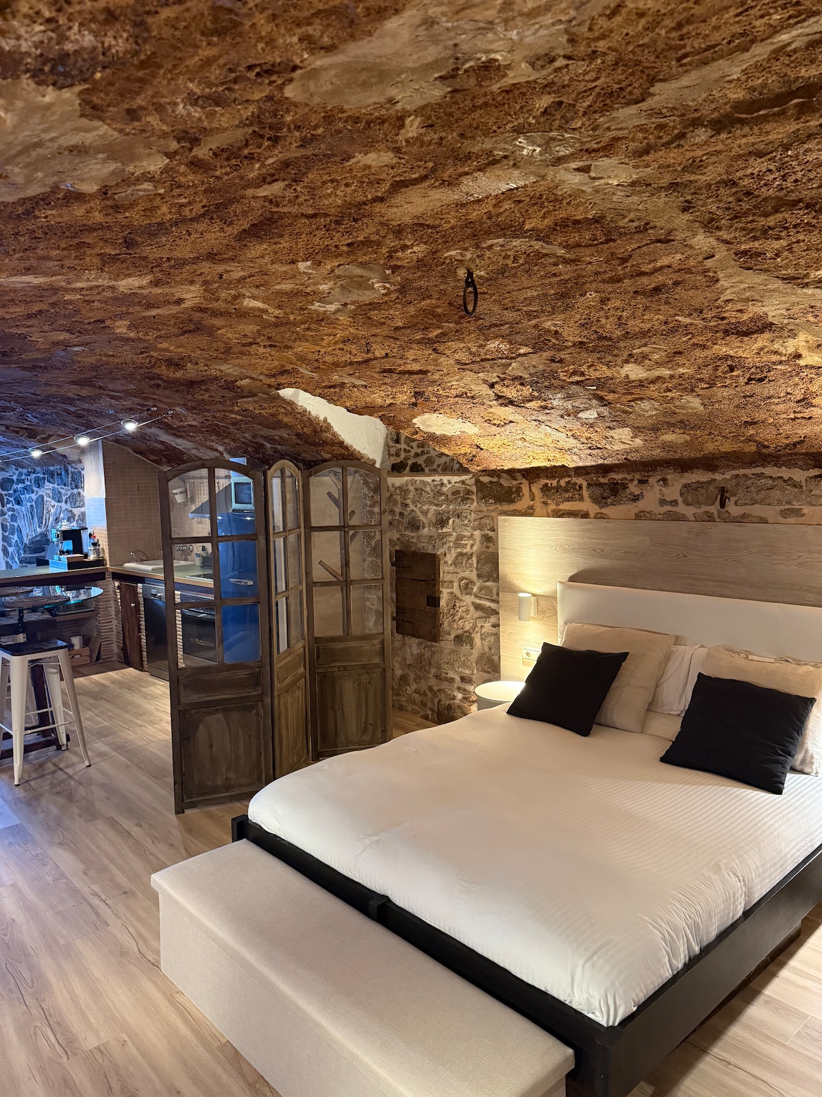 The barn has a living room with a black kitchen, a bedroom with a double bed, a loft with two beds, and a sofa bed in the living room. It also has a double shower with a window to admire nature while showering. Fireplace, swimming pool, and river. And an environment with a monumental complex formed by a Romanesque church with a crypt, a modernist cemetery and an Iberian village 5 minutes away. Spectacular! 5 minutes from a rural restaurant and 10 minutes from the town/city.
