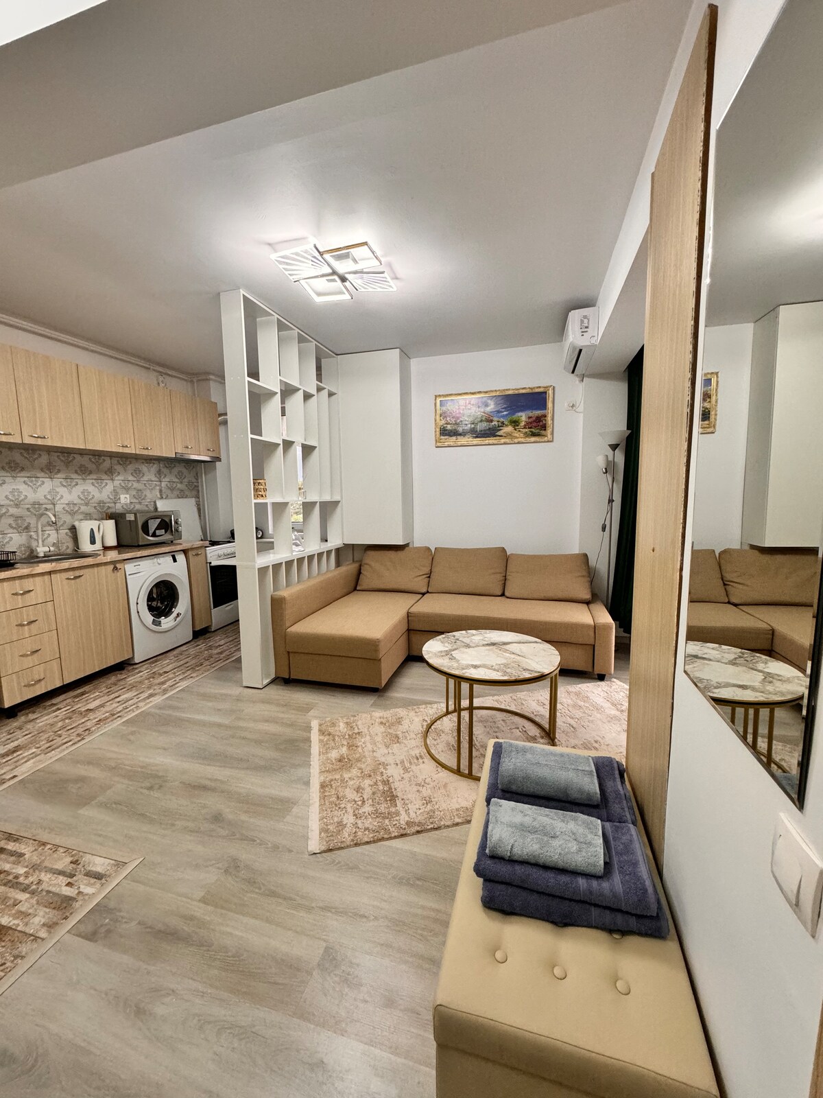 A brand new studio apartment with a modern design and an amazing view over the city, located in an new residential complex.The studio is located at just 4 minutes walking from the 1 Decembrie 1918 subway station, next to the building we have supermarket Lidl, Auditorium Pallady and easy access to A2 highway. Also underground free parking is available during your stay. Inside the cozy studio we have smart TV+Netflix, free Wi-Fi, plus self checking available.